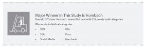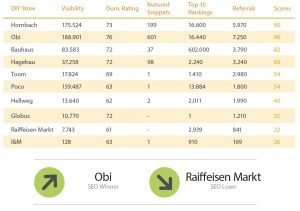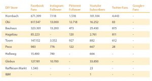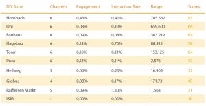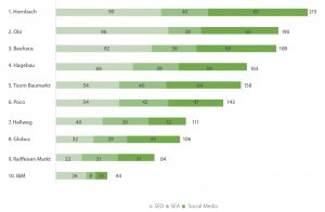 Overall, these three companies are obviously at the top of the comparison: Hornbach, Bauhaus and ObiAll three DIY stores not only attach value to one of the listed channels, but also pursue a strategy in the field of SEO, SEA as well as Social Media to optimize their performance.