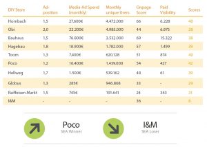 In the area of the SEA, the DIY stores are evaluated under their performance on the average Ad Position, Media Ad Spend, Unique Users, Onpage Score and their Paid Visibility.